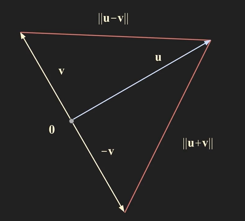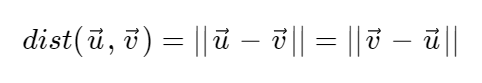 - Distance : Rn space의 vector u와 v를 생각해보자, 두 벡터 사이의 거리를 dist(u, v)로 표현하며 dist(u, v) = u - v의 norm이다. (또는 v - u 의 norm)