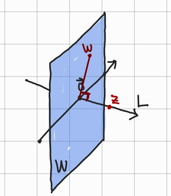 - L을 원점을 지나면서 W에 수직인 직선이라 하자.