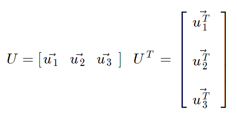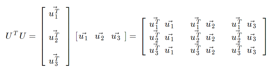 이때 column vector들이 orthonormal하므로 자기 자신과의 내적인 diagonal term은 언제나 1이며, 서로 다른 vector간의 내적은 항상 0이다. 따라서 UTU = I이다. 그리고 이렇게 모든 column vector들이 orthonormal vector인 경우, Matrix U를 orthogonal Matrix 라고 한다. (이유는 알 수 없지만 여러 경우에 orthonormal해야만 하는 경우임에도 orthogonal이라는 표현을 사용하는 경우들이 있다. 이 경우도 마찬가지로, orthonormal Matrix라고 하지 않고 orthogonal Matrix라고 한다. 그러나 각 column vector들은 반드시 orthoNORMAL 해야함을 기억하자.)