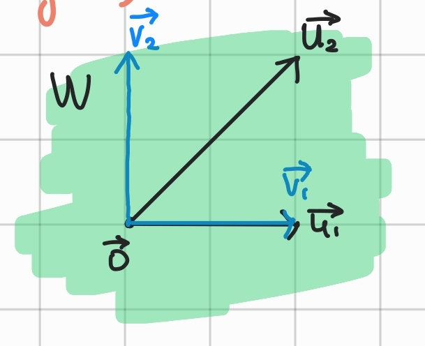 그람-슈미트 과정의 Basic idea부터 설명하자면, W subspace를 span하는 basis인 {u1, u2} 를 알고 있다고 생각하자. 그러나 u1과 u2는 orthogonal set은 아니다. 그럼 이때, W를 span하는 orthogonal basis를 찾을 수 있는가?