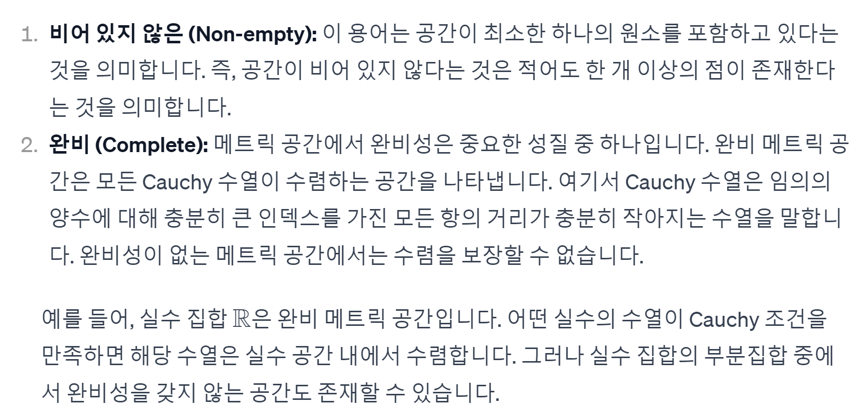 - non-empty complete metric space인 실수집합 R과, R상에서 거리를 정의하는 유클리디안 distance d가 존재한다. (R,d)