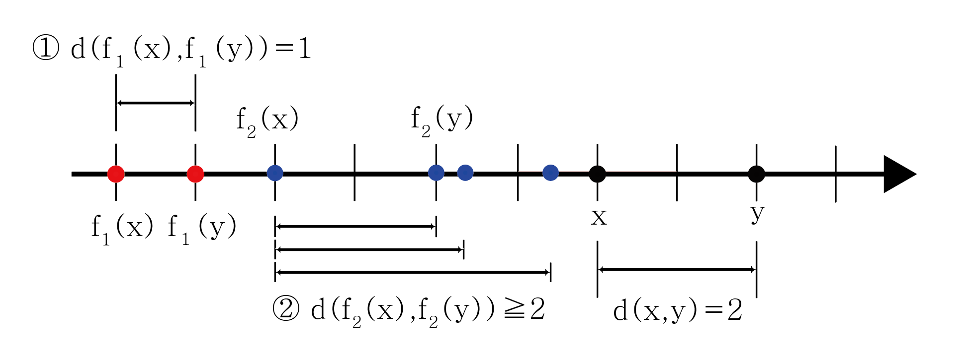 여기서 q ∈ [0,1)은 위에서 언급한 'T(x)와 T(y)의 거리는 x와 y의 거리보다 반드시 짧아야 한다'를 나타내기 위한 상수이다. 1이 포함되면 안된다는 것을 유의하자, 다시말해 그림2에서 파란 점들로 이뤄진 ②함수 값 중에 그나마 가장 짧은 경우도 d(f2(x), f2(y)) = 2 이므로 d(x,y)와 같기 때문에 최소한 q는 1과 같아야 한다. 이러면 q의 범위를 만족하지 못하므로 ②함수의 경우는 contraction mapping function이 될 수 없다는 것이다. 물론 2보다도 큰 그 외의 값들은 애초에 쳐다볼 필요도 없다.