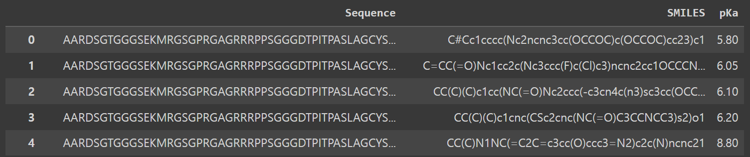내가 다루는 데이터는 Target Protein - SMILES seq - pKa Value로 구성된 triplet structure의 dataframe이다.