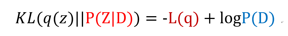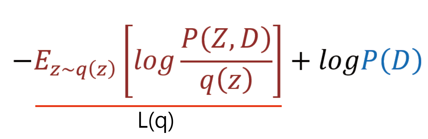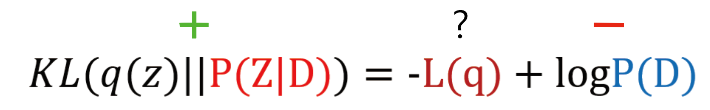 자, 이제 -L(q)는 음수여야 하는가 양수여야 하는가? 그렇다면 L(q)는 음수여야 하는가 양수여야 하는가? 자명하지만 L(q)는 반드시 음수여야만 하고 그 값은 logP(D)보다 반드시 작아야만 한다. 그렇지 않은 경우에는 좌항의 KLD값을 양수로 만들 수 없다.
