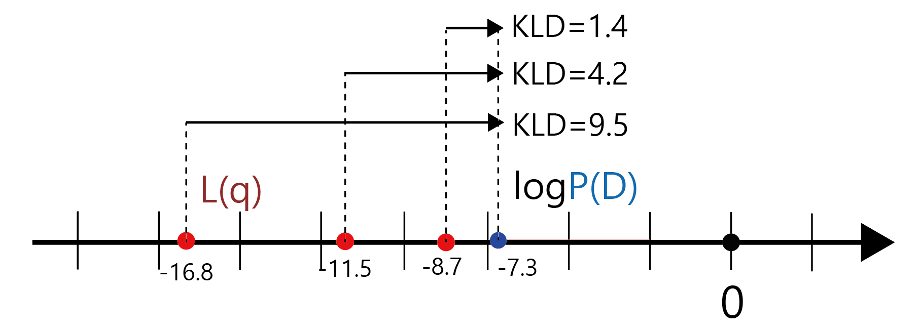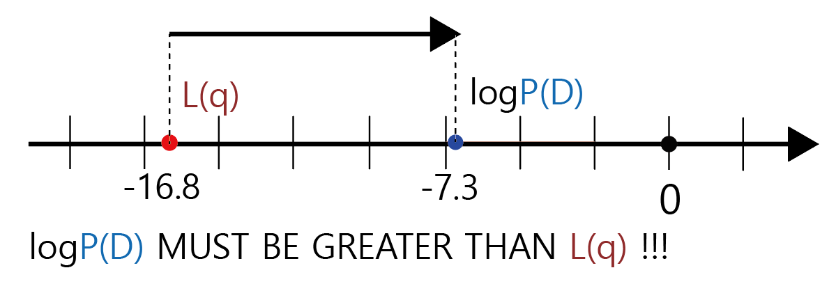 쉬운 이해를 위해서 logP(D)값이 임의로 -7.3이라는 값을 가졌다고 해보자. L(q)는 -16.8이라는 값을 가졌다고 해보자
