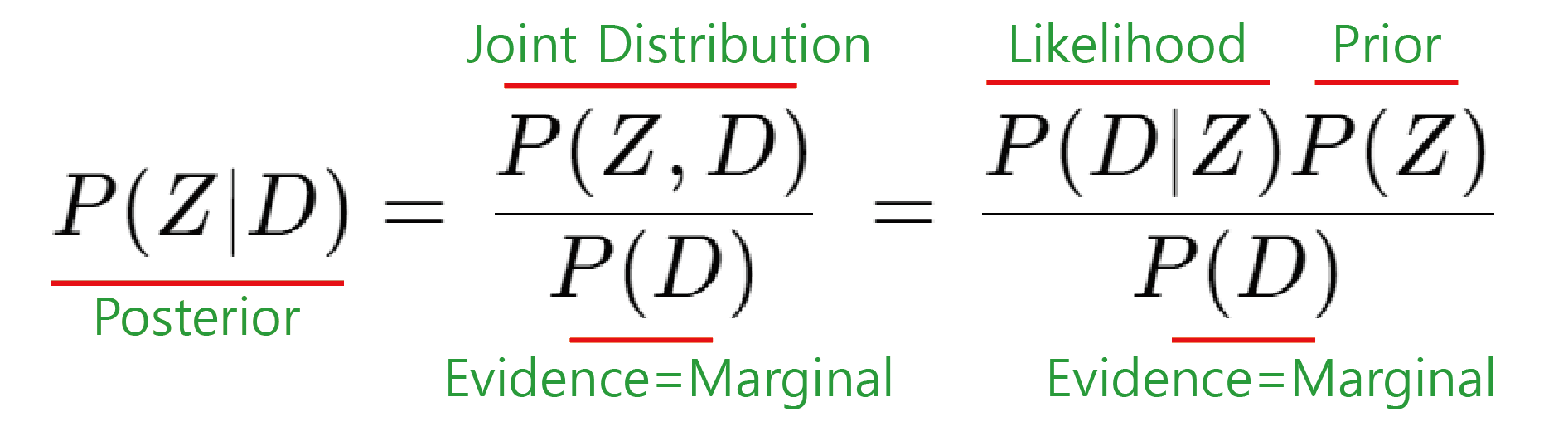 이 경우 우리는 Joint Probability P(Z,D)를 알고 있는 것이다. (P(Z|D)를 알고 있는 것이 아니다.) 이제부터 D로부터 Z의 정보를 알아내어 Posterior P(Z|D)를 찾아보려 한다. 이렇게 '어떤 정보를 이용하여 또다른 정보를 추론해내는 과정'이 들어가면 머신러닝이나 딥러닝 분야에서 'Inference'라는 용어를 사용한다. Variational Inference에서 "Inference"라는 용어가 등장하는 이유는 여기에 있었다.