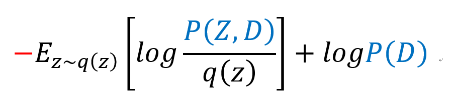 이때 우항의 logP(D)는 Random Variable Z와 무관한 상수값이므로 Expectation을 제거할 수 있고, 좌항은 로그성질에 의해 음수로 바꿔 준 뒤, 분자와 분모의 순서를 바꿔줄 수 있다.