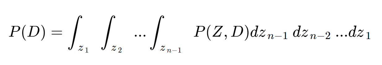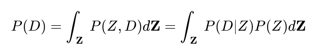 위에서 Joint probability P(Z,D)는 우리가 접근 가능한 값이라고 하였다. 다시말하면 Likelihood와 Prior는 우리가 알 수 있다는 것이다. 그런데 Evidence 또는 Marginal값은? (지금부터는 Evidence로 통일하겠다.) P(D)를 구하기 위해서는 Joint distribution인 P(Z,D)에서 Z를 marginal out시켜야 한다. Z는 continuous variable이므로 다음과 같은 식이 되겠다.