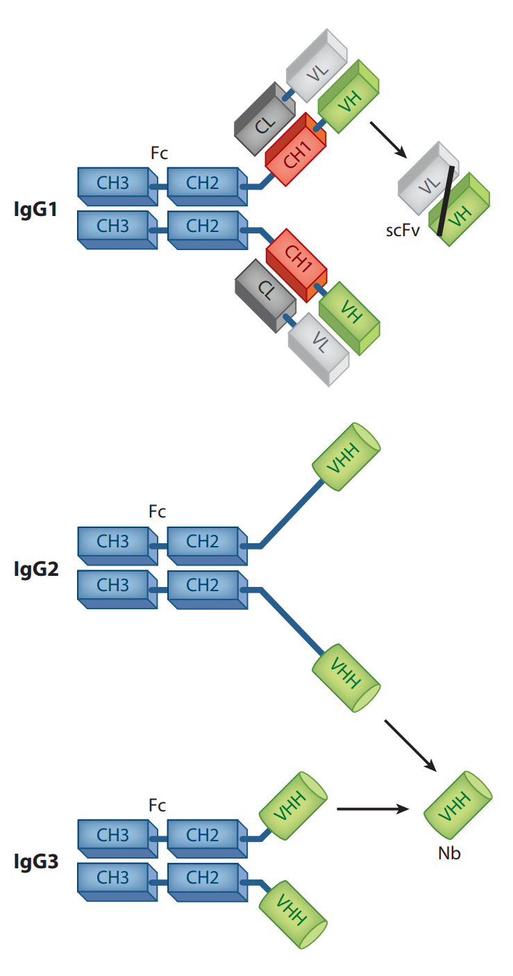 Mammals에서 별난 형태의 Antibody를 갖는 동물이 있는데 바로 낙타류(Camelidae)의 동물들이다. 얘들은 별나게도 Human의 Ab와 구조가 동일한 IgG1 타입 외에도 Heavy chain으로만 이루어진 Heavy Chain Antibodies (HCAbs)라는 형태의 Ab를 가진다. 이 HCAbs는 IgG2와 IgG3로 2개의 subtype이 존재한다. 이것들은 특이하게도 CH1이없고, Light Chain이 없다. IgG2는 IgG3보다 hinge 부분이 더 길다. HCAbs의 HC의 끝부분에는 Heavy Chain Antibody Variable Regeion (VHH) 라는 이름의 기능적으로 IgG1의 antigen binding Fragment (Fab)와 동일한 Antigen binidng 역할을 하는 부분이 존재한다. HCAb의 VHH는 single variable domain으로 antigen binding 여부를 쉽게 파악할 수 있다. 항원을 낙타류에 찔러넣어 immunizing을 한 뒤 blood를 뽑아내서 B-cell을 얻고 항원을 재차 주입하여 VHH를 많이 만들게 한 뒤 phage display등을 이용해서 panning하면 된다.