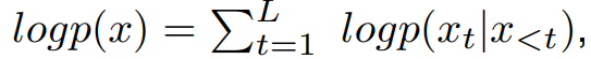 D3PM은 transition matrix를 이용해서 원본서열을 복원하는 학습방법으로 기존 autoregressive model의 경우 chain rule에 의해서 데이터 x의 발생할 log-likelihood를 다음과 같이 정의함