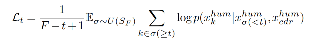 Summation기호는 t=1~F까지 순서대로 해당 token의 log likelihood를 말그대로 문자열의 길이 F개까지 summation하는 것이고, 조건부로 붙어있는 xσ(<t)는 예시에서 설명 한 것 처럼 t이전까지만의 서열의 정보를 입력으로 사용한다는 것, xcdr은 모델이 뱉어내는 log likelihood값을 얻기 위해 모델에 cdr의 정보를 함께 전달한다는 의미이다.