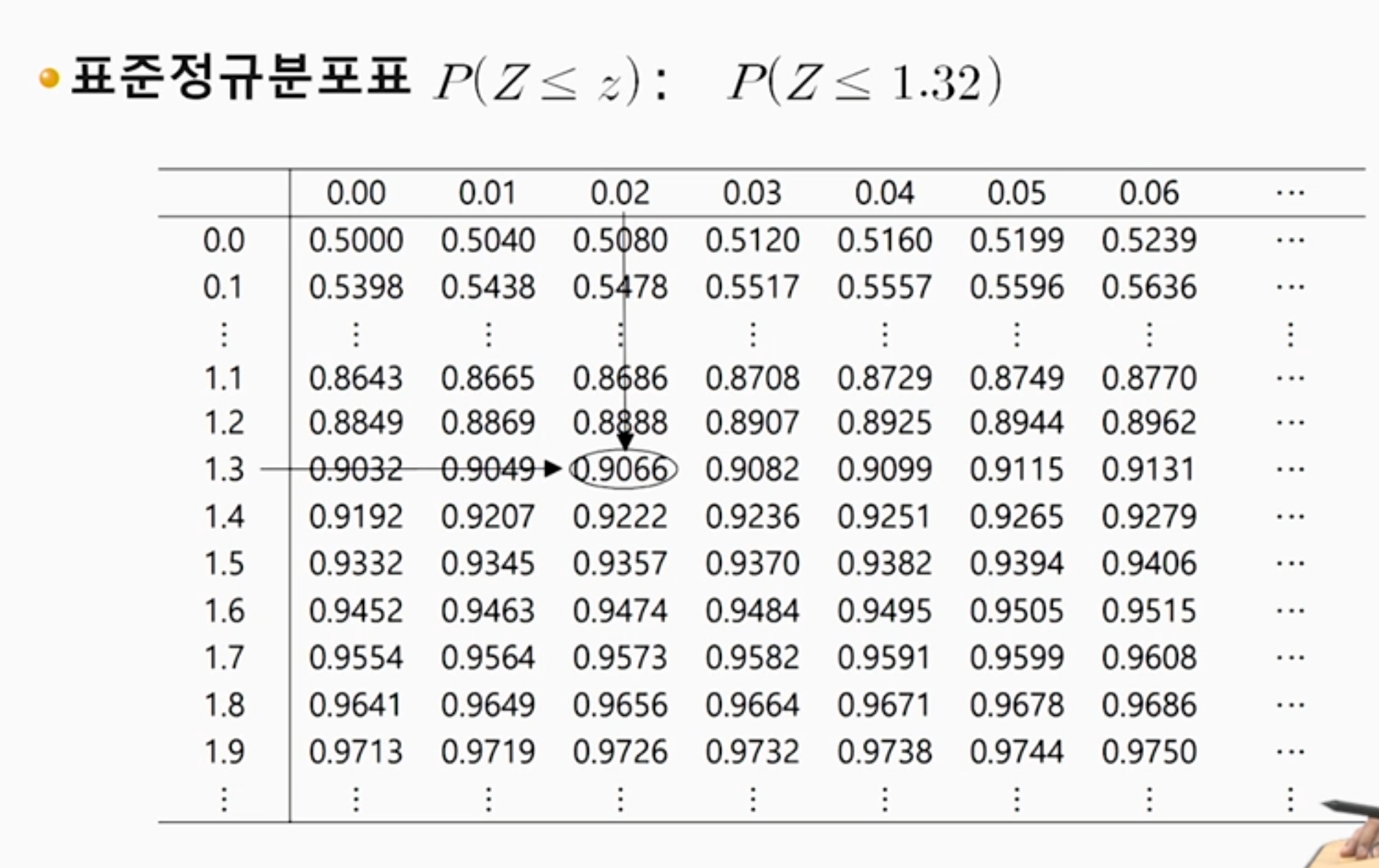 이때 P(Z ≤ z)는 표준 정규분포에서 x축의 값을 z라고 했을 때, 표준정규분포에서 z값보다 작은 부분의 면적을 계산한 것이며 그 예로 P(Z ≤ 1.32)일 경우 x축의 값이 1.32보다 작은 부분의 면적을 계산하고 싶다는 의미이다.
