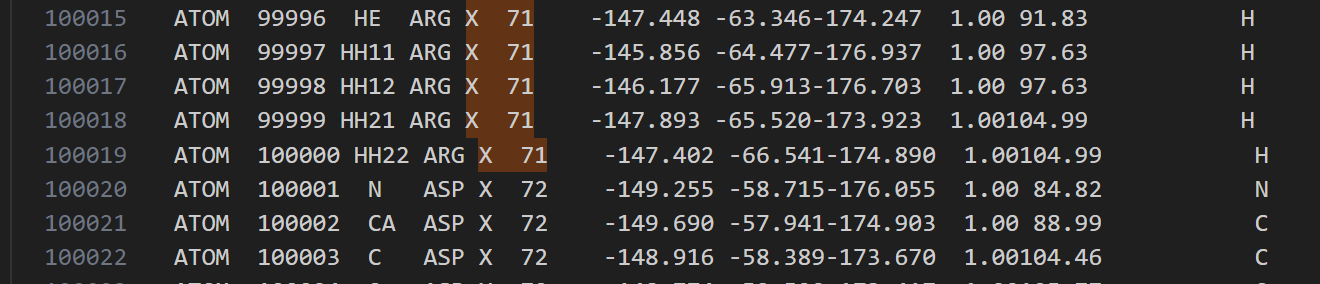 이 코드는 PDB파일의 22번째~26번째 컬럼의 값을 가져와서 split하고, 그 첫번째 값을 resseq이라는 변수에 저장하라는 코드이다.눈치가 빠른 사람들은 바로 느낌이 올텐데, 올려둔 PDB 예시를보면 ATOM 뒤에 99999가 넘어가면서 100000으로 컬럼이 한칸 밀려버린다.