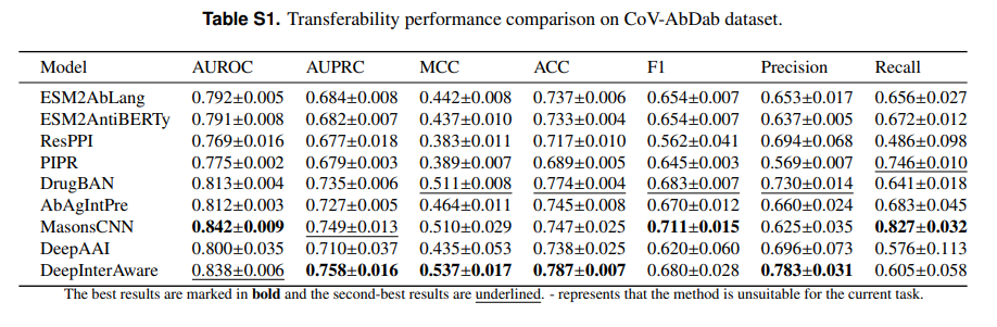 특히 항원 항체 모두에 대해서 Unseen인 경우의 성능 차이가 크다는 점에서 강조하였다.