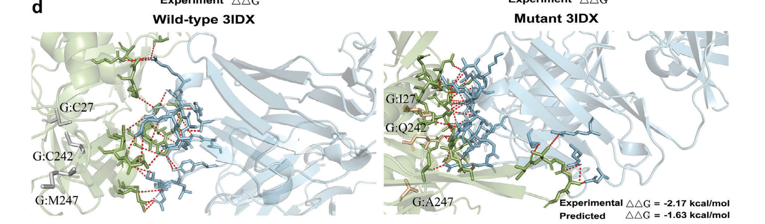 이것도 Case study로 보여주기 좋은 실험같다. Wildtype과 비교해서 Mutant를 보여주고, 실험적으로 ΔΔG값이 더 좋아진 경우를 하나 시각적으로 보여주면서 Predicted ΔΔG도 더 좋아진 것을 하나 선택해서 가장 직관적으로 와닿는 경우를 보여준다. 사실 뭐.. 체리피킹하기 너무 좋은 결과이지만 이 분야에서는 이정도 체리피킹은 어느정도 용인하는 분위기니까 나도 사용해봄직 하다.