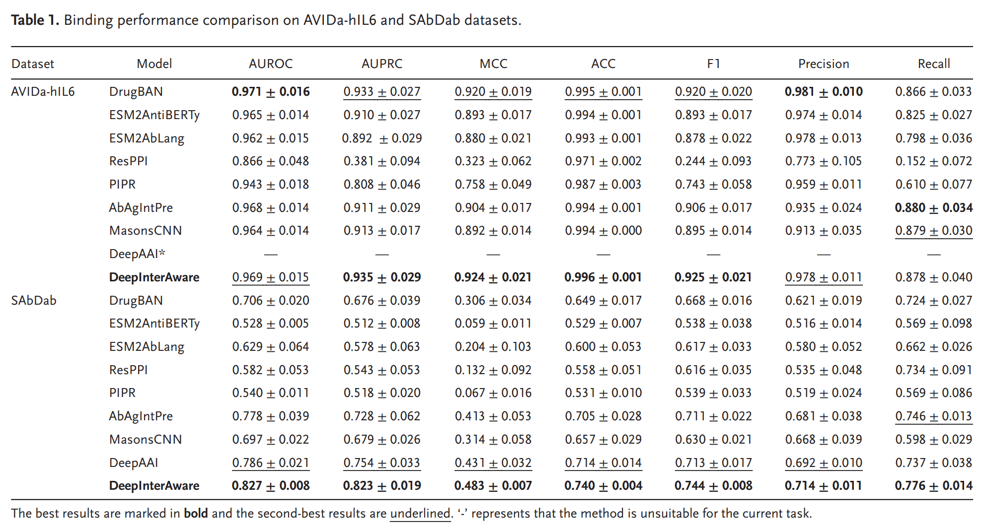 여기에 추가로 HIV와 함께 CoV-AbDab dataset을 사용해서 모델이 다른 Antigen에 대한 평가도 진행했다. 우선 AAI prediction 성능 비교표를 보면 다음과 같다.