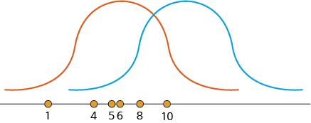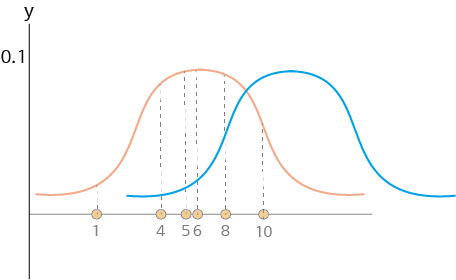 Q. 위와 같은 확률 분포 2개가 있다고 생각하고, 데이터를 얻었을 때 X = {1,4,5,6,8,10}이 얻어졌다고 생각해보자. 이 데이터를 추출한 확률밀도함수는 주황색 분포일 확률이 높을까 파란색 분포일 확률이 높을까?