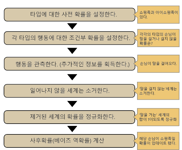 예를 들어 여기서 경험에 의해 손님 열 명중 두명은 실제로 물건을 구매하였고, 나머지 여덟은 물건을 구매하지 않았다고 판단한다면, 이때의 사전확률은 P(쇼핑족) = 0.2, P(아이쇼핑족) = 0.8이 된다.