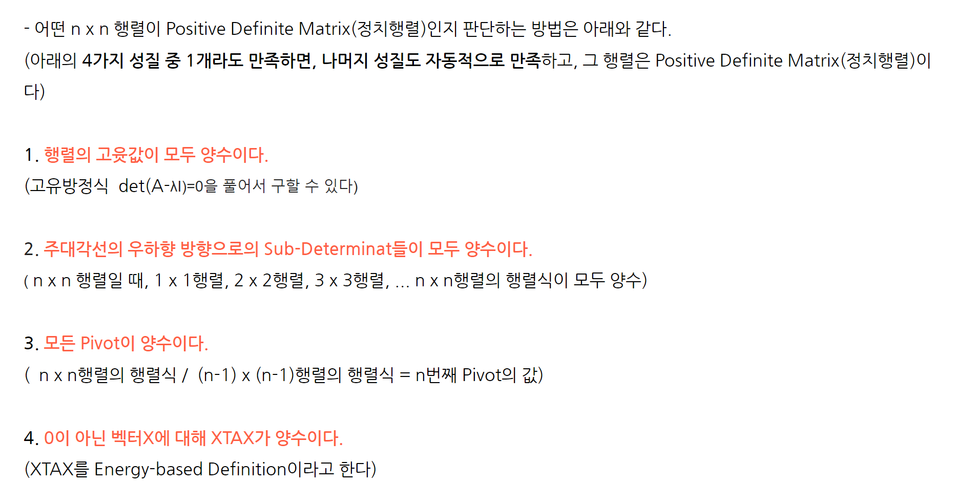 * 추가내용 : positive definite matrix는 위 조건 뿐 아니라 아래 4가지 조건을 이용해서 나타낼 수 있다.