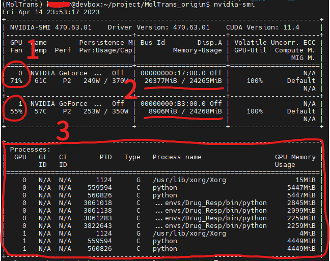 4. [3번 박스] 몇번 GPU에서 어떤 process가 돌아가고 있는지를 상세히 확인할 수 있다.