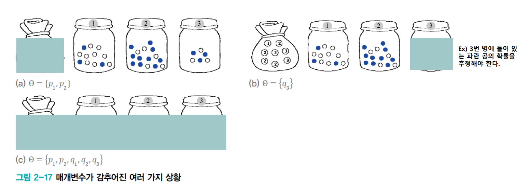 (b)그림의 경우 3번 병 공들의 분포를 전혀 알지 못하는 경우이다. 이때 3번 병의 파란공의 분포를 q3라고 하면 하얀 공의 분포는 자동적으로 1-q3로 계산되므로 추정해야 할 파라미터는 Θ={q3}하나가 된다.