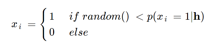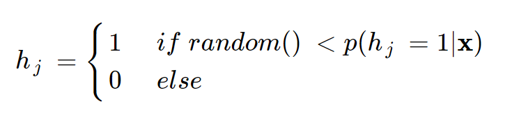 식 10.22에서 구한 p(hj=1|x)값이 0 ~ 1사이의 랜덤 난수보다 크면 hj=1이되고 그렇지 않으면 0이된다.