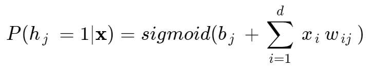 1. 입력 노드에 랜덤 샘플 x = (x1, x2 ... ,xd)T가 입력되었다고 생각하자. 가시 노드의 벡터가 고정되었기 때문에 은닉노드의 값을 결정할 수 있다. 깁스 샘플링 방식에 의해 은닉노드 hj의 값은 다음과 같이 결정된다.