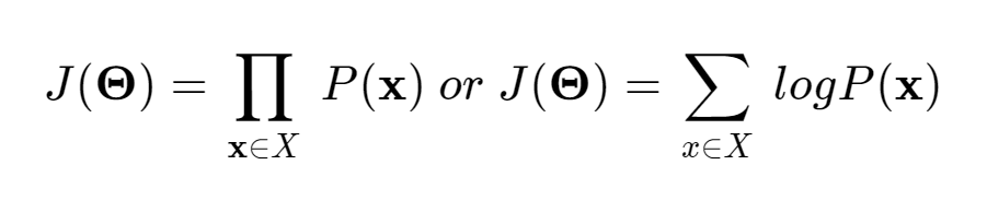거대한 파이(π) 기호는 product로써 훈련집합 X에 속하는 모든 input vector x들의 각각의 발생확률의 곱을 뜻한다. 그러나 확률의 정의에 의해 각각의 P(x)값은 반드시 0 ~ 1 사이의 값을 가지며, 대체로 훈련집합에 속하는 데이터의 수 n은 최소 수십개에서 수천 수만개까지 존재할 수 있기 때문에 이것을 모두 곱하여 나가면 그 수가 너무 작아져서 훈련이 불가능한 경우가 많다. 따라서 주로 product 연산을 그대로 사용하기보다는 로그를 취해 곱연산을 합연산으로 바꿔 훈련한다.