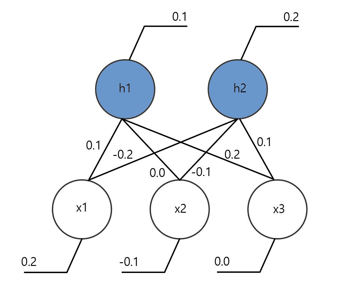 P(h2 = 1|x) = sigmoid( 0.2 + (1 x (-0.2) + 0 x (-0.1) + 0 x 0.1) ) = 0.5
