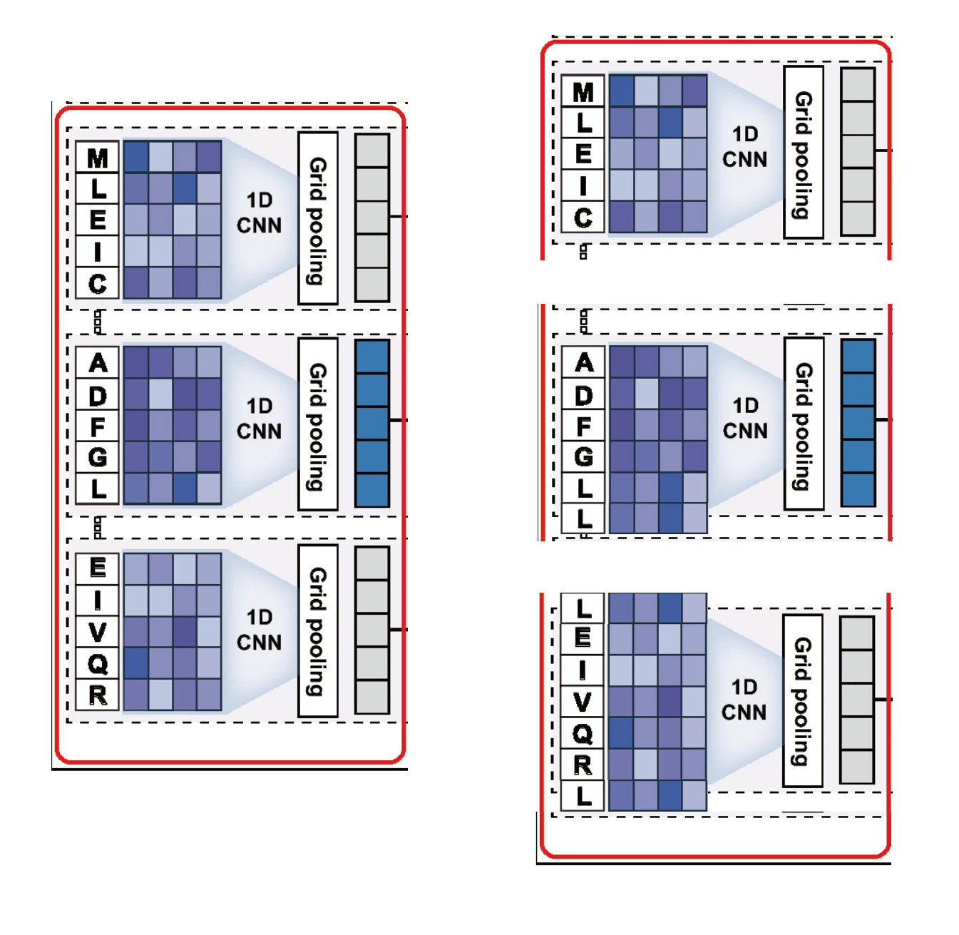 CNN의 각 window 별로 연산된 conv result는 equal length를 가지며 각각을 protein grid라 칭한다. 각 protein grid에서 max value를 pooling하는 global max pooling방식을 이용한다.