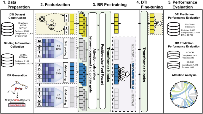이후 Tranformer모델을 지나면서 둘사이의 interaction을 파악한다. BR predictor를 pre-train시키면서 BR의 location, size, confidence score를 파악한다. Additional Transformer모델을 지나면서 DTI prediction에 적합하도록 compound token은 fine-tune된다.