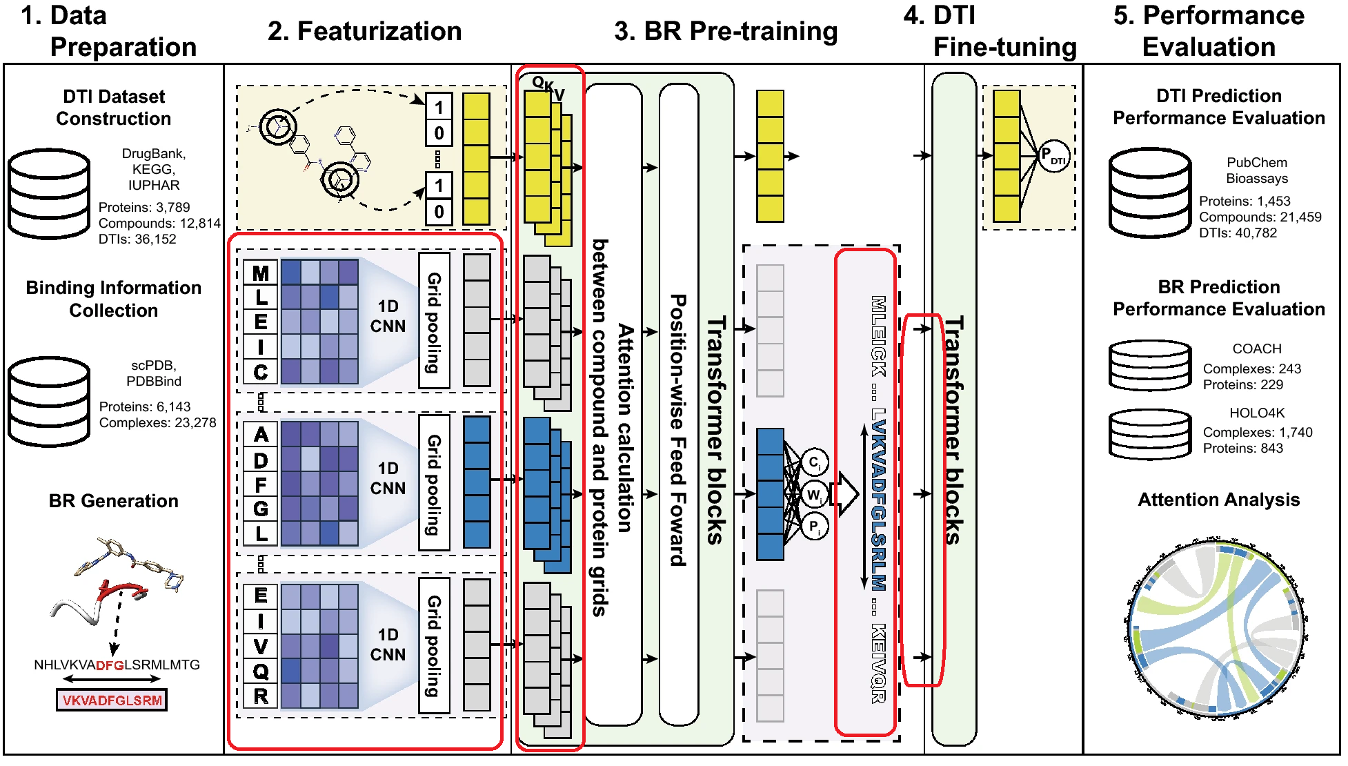 HoTS는 Binding Region(BR)이라는 DTI에 중요한 역할을 하는 위치를 hilights한다. BR을 찾기 위하여 Protein의 sequential motif를 찾아내는 CNN과 Drug/Protein sequential motif간의 interaction을 attention하는 Transformer를 이용한다.