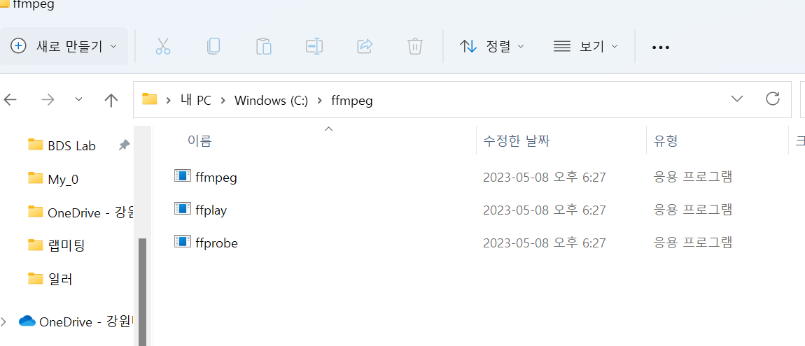 5. C드라이브로 이동하고 ffmpeg또는 원하는 영어폴더를 생성하고 그 폴더 안에 복사한 파일들을 붙여넣는다.