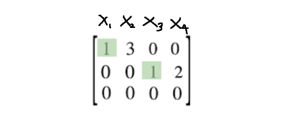 위 그림에서, x1과 x3는 pivot position에 위치하므로 변수로나타내지만 x2와 x4는 pivot position에 존재하지 않기 때문에 free variable로 나타내야 한다.