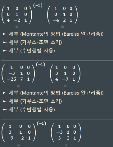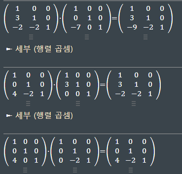 - 이때 항등항렬 I를 곱하는 것은 결과에 영향이 없으므로 L = (Ep...E1)-1I라고하자