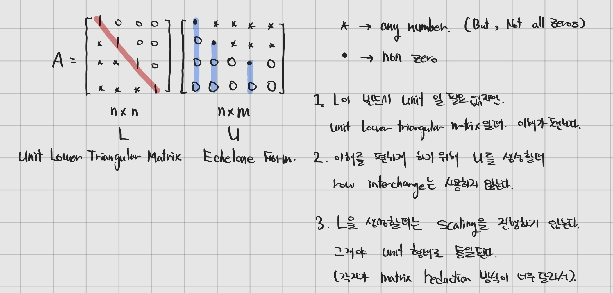 - 그럼 어떻게 L과 U를 구하는가? LU를 구하는 algorithm을 알아보자