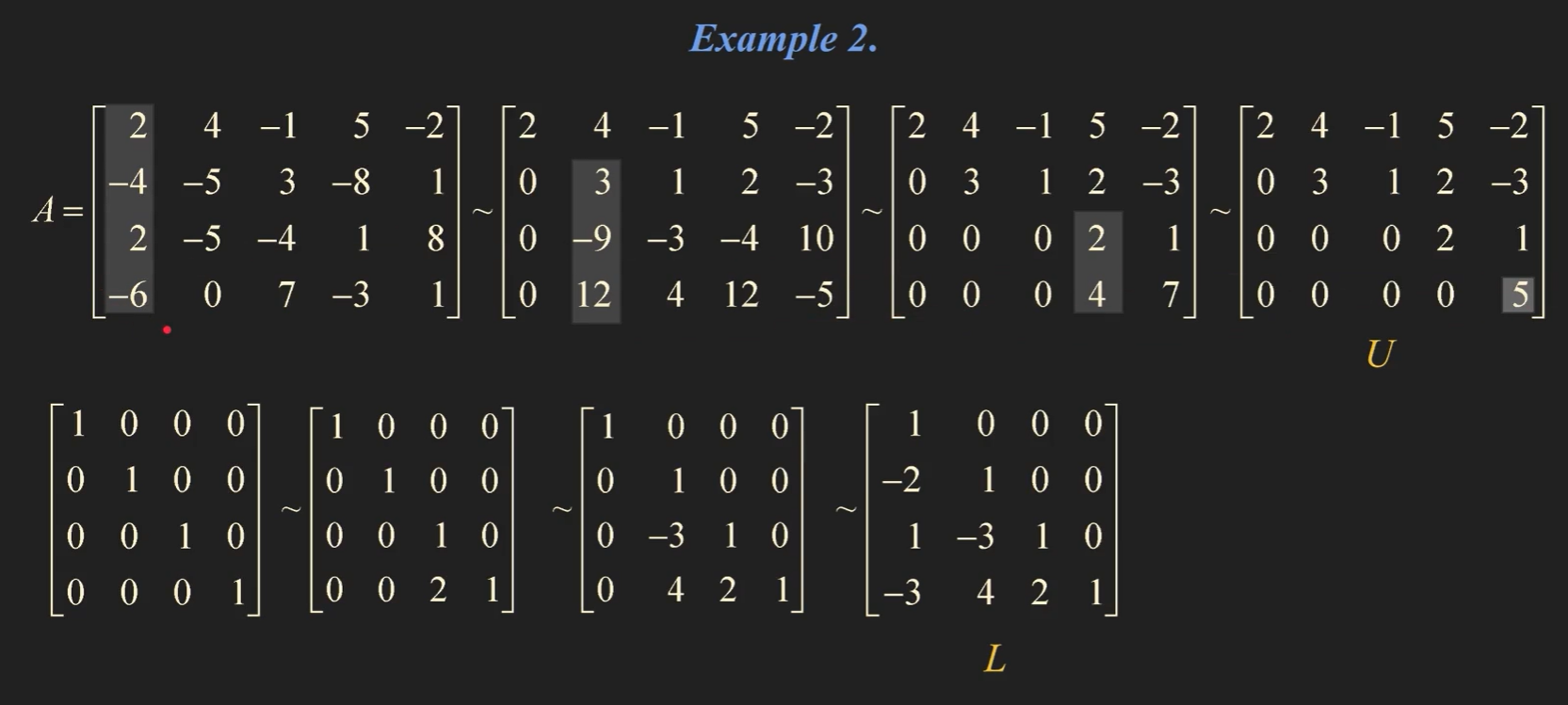 - 한마디로 정리하면, 어떤 임의의 matrix A를 U(Echelone Form)을 만들기 위해 수행한 Elementry matrix들의 [역함수!]를 항등행렬 I에 역순(또는 정순)으로 수행하면 L이 만들어진다.