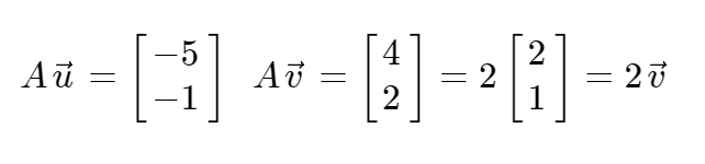 u벡터는 A matrix 연산 결과가 자기자신의 곱으로 나타나지 않는다. 반면 v벡터는 A matrix 연산 결과가 2v로 자기자신의 scalar 곱으로 나타난다.