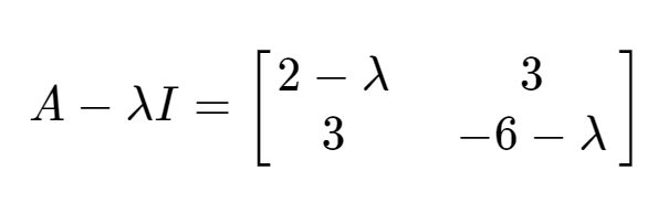 이때, det(A-λI)는 다음과 같다. det(A-λI) = ad-bc 이므로 -(2-λ)(6+λ) - 3*3 = (λ+7)(λ-3) 따라서 λ = 3 or -7이다. 이때 (λ+7)(λ-3) 이 식을 Characteristic Equation이라고 한다.