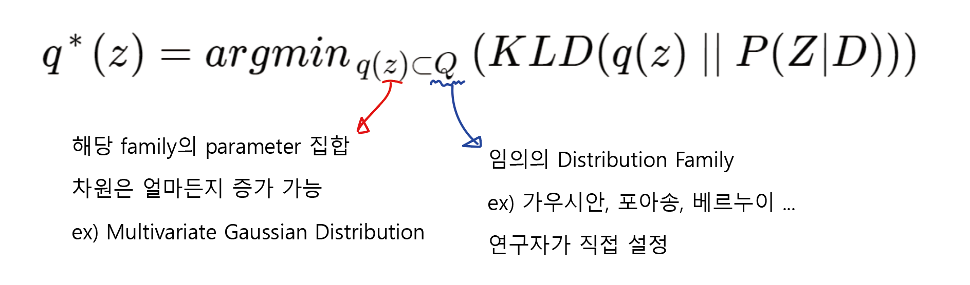 다시말해 Posterior Distribution P(Z|D)와 KLD값이 최소가 되도록 하는 최적의 surrogation distribution q*(z)를 찾겠다는 것인데, 이때 q(z)는 simple parameter를 가지는 명확한 closed form이 구성되어 있는 distribution을 사용한다. 아주 대표적인 것이 평균과 분산을 파라미터로 가지는 가우시안 분포가 있겠고 실제로 VAEs에서는 이 가우시안 분포를 q(z)로 사용한다. 물론 연구자에 따라 가우시안이 아니라 다른 분포를 사용할 수도 있다.